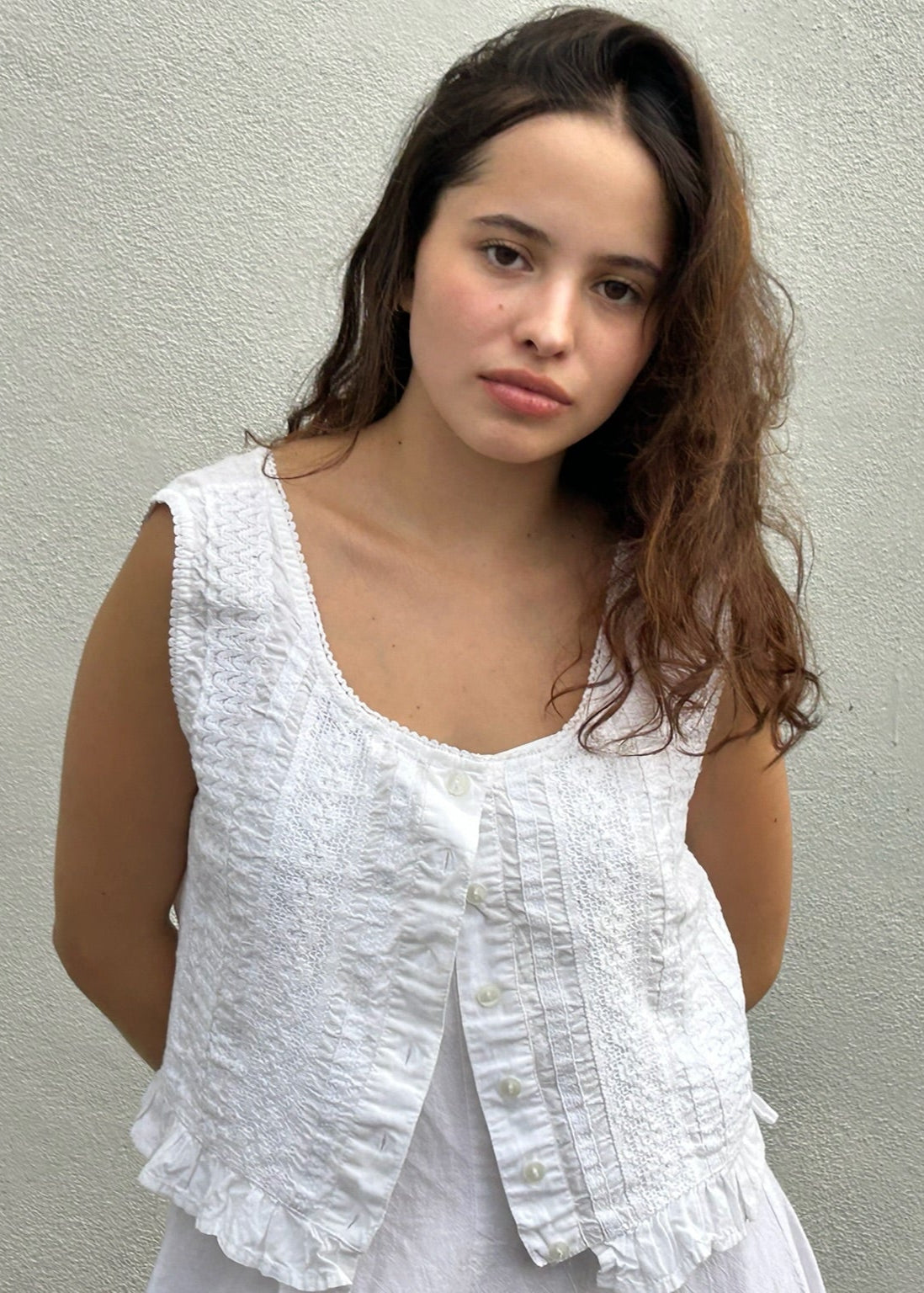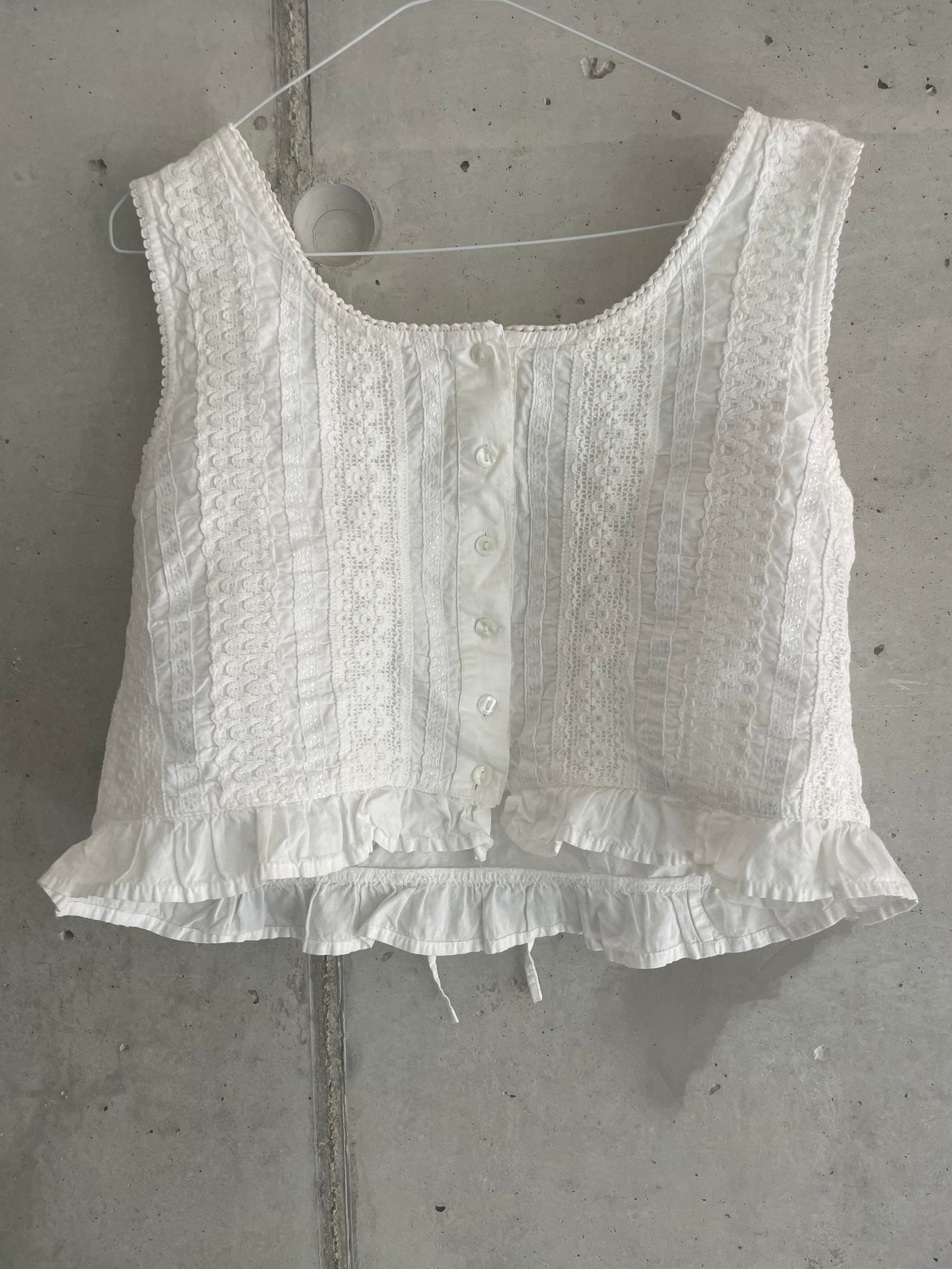 Vintage-inspired vest crafted from cotton with lace detailing on the front. Features a button closure and an adjustable strap at the back.