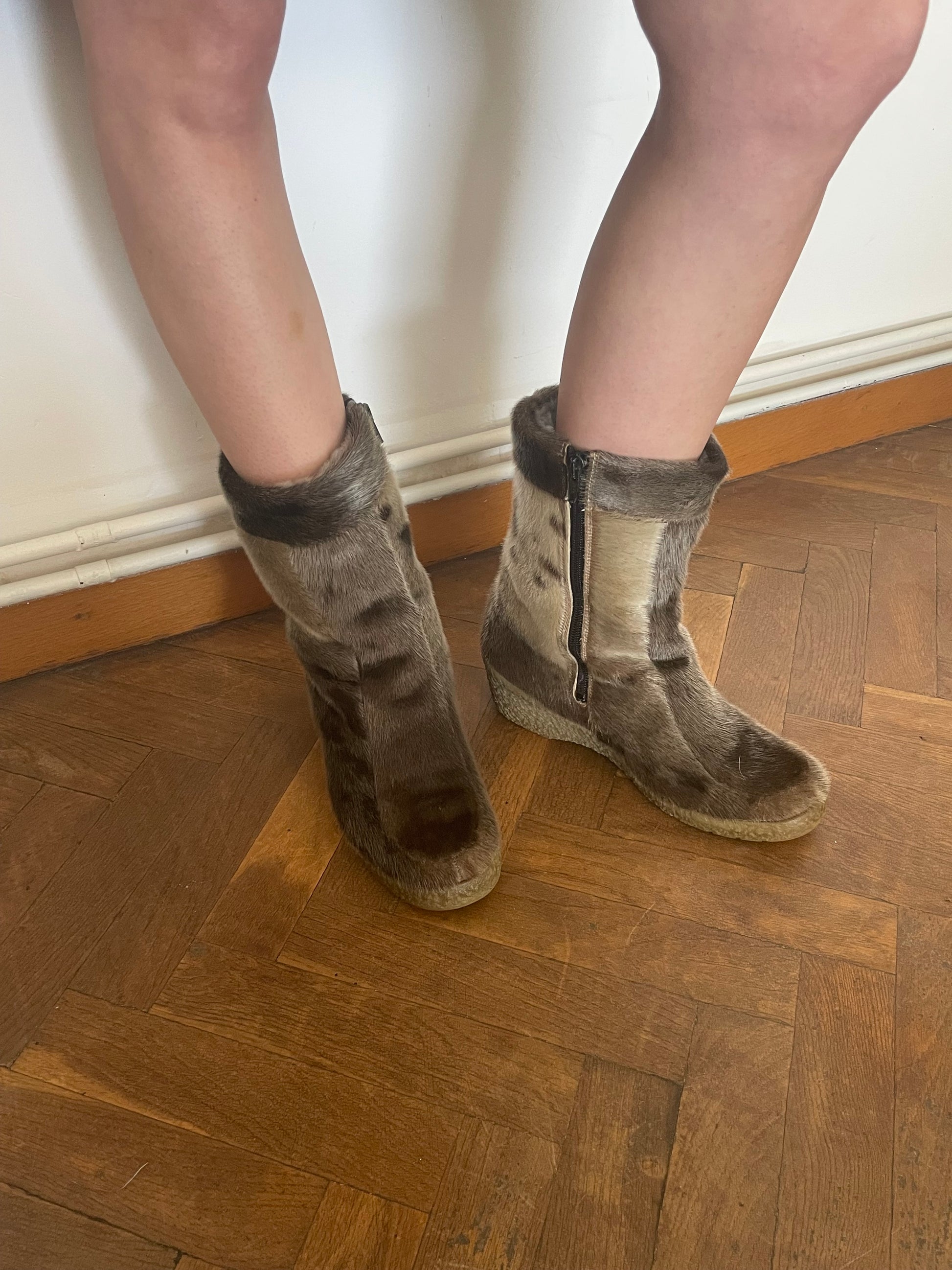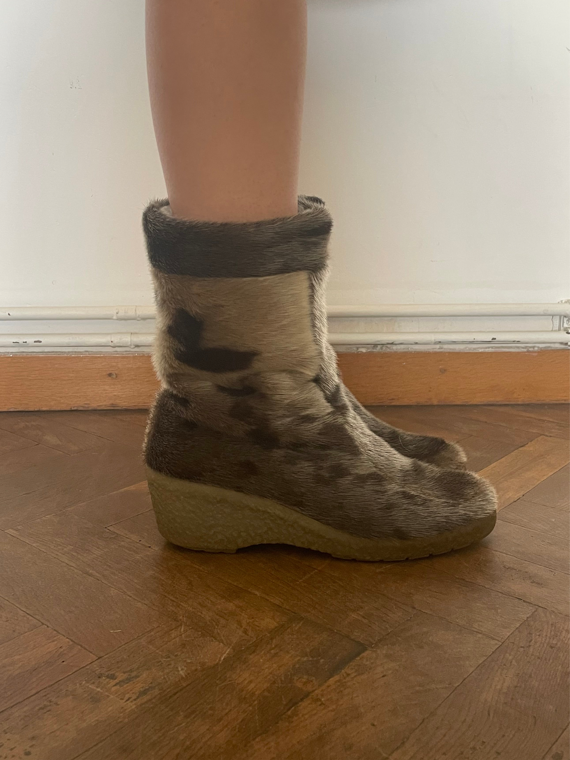 Mid-calf genuine fur wedge boots in a brown and beige animal print. Cozy, plush texture and a comfortable crepe textured rubber wedge sole.