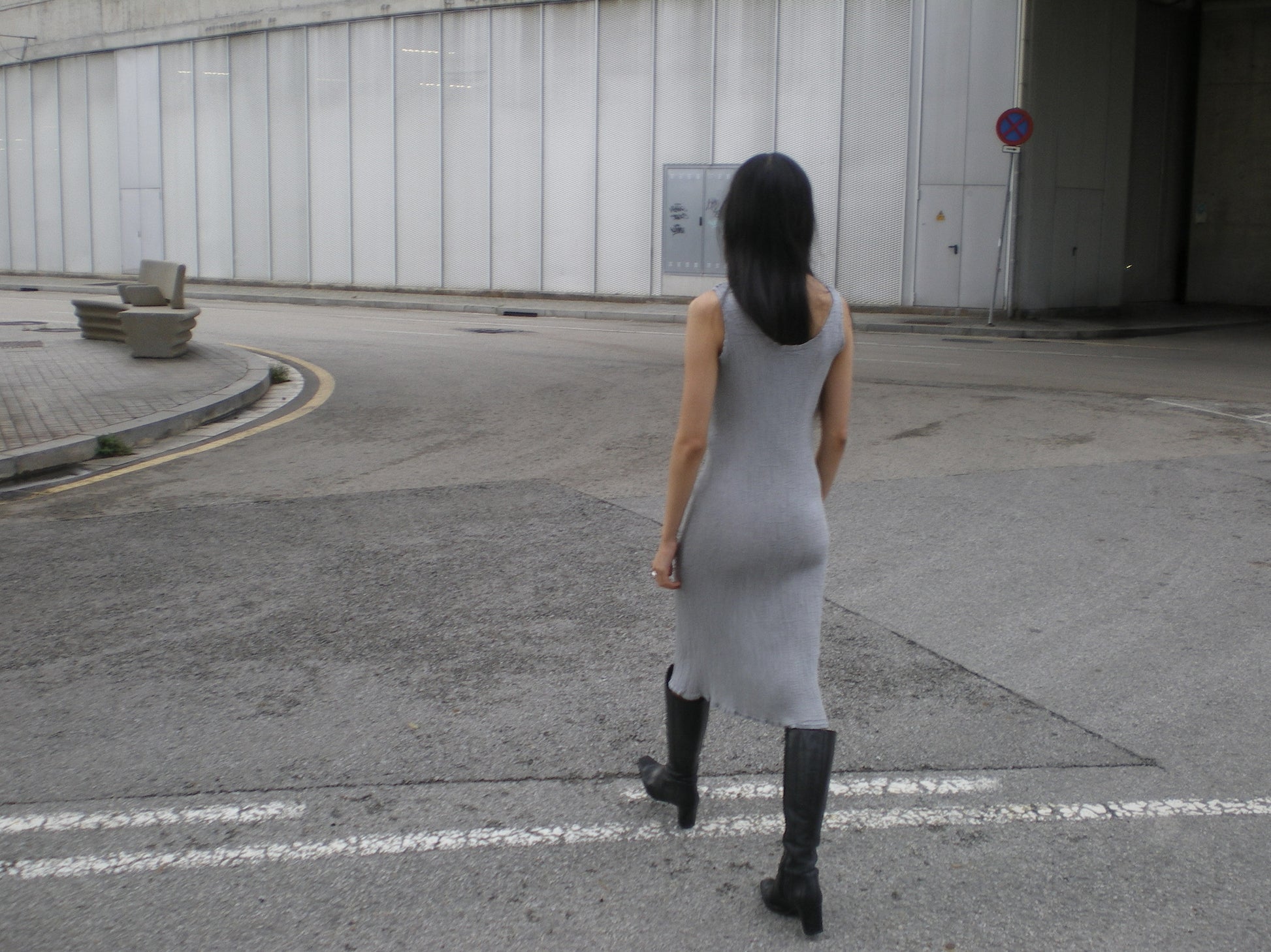Issey Miyake dress from the ME line, known for its innovative irregular pleating that adapts naturally to the body like a second skin, allows the garment to stretch and recover, making it suitable for multiple body types while maintaining its shape. Designed with a slightly flared midi cut, U-neckline, and wide straps. Cool grey tone fabric. Wear it on its own for a clean, architectural look, or layer it over other garments for a more experimental silhouette.