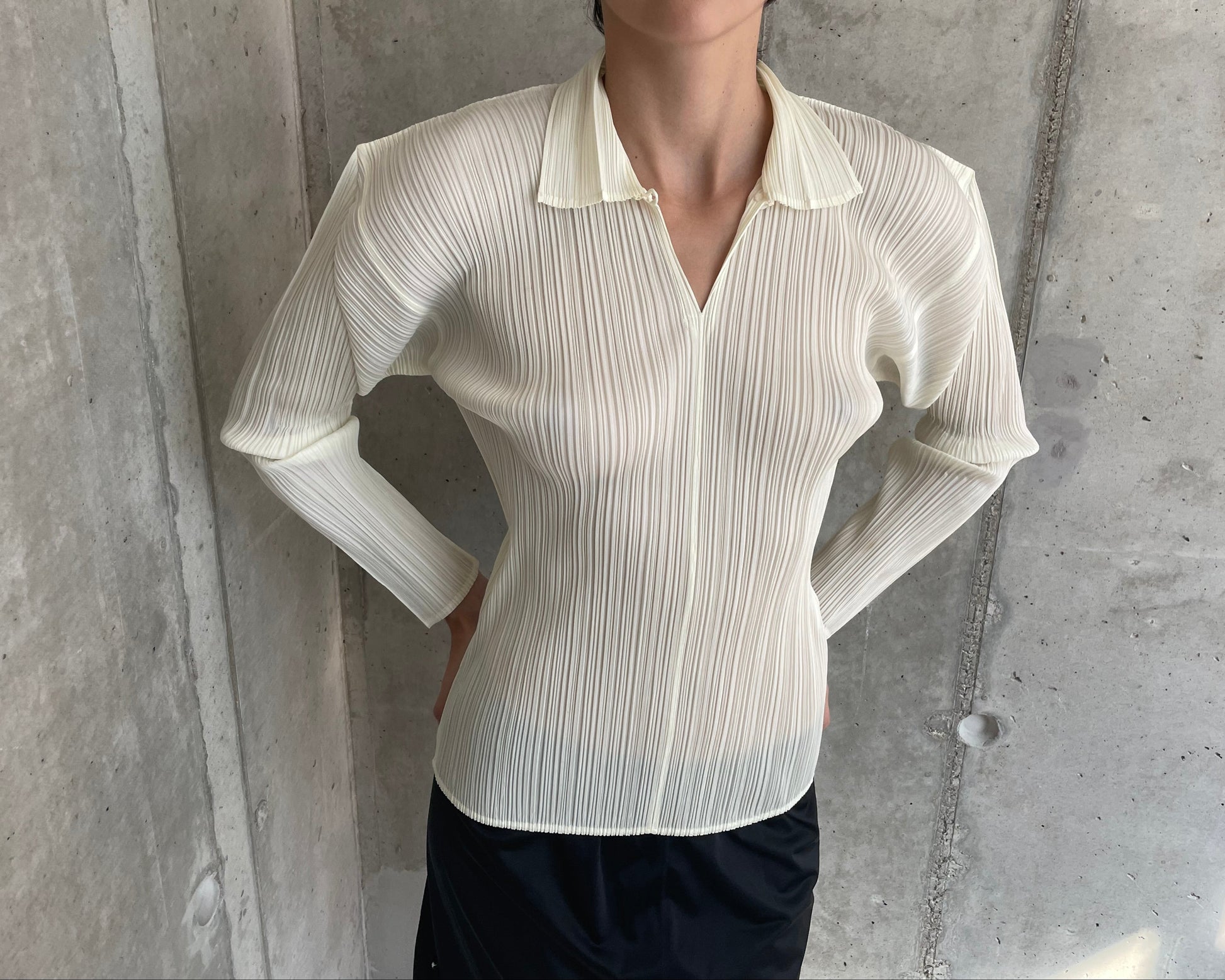 Soft cream-colored shirt from the iconic Pleats Please collection. Featuring signature pleats throughout, with sculptural sleeves and shoulders that create a unique, architectural silhouette. Classic shirt collar and a single button closure at the neck, seamlessly integrated into the pleated design. This item has been directly sourced from Japan.