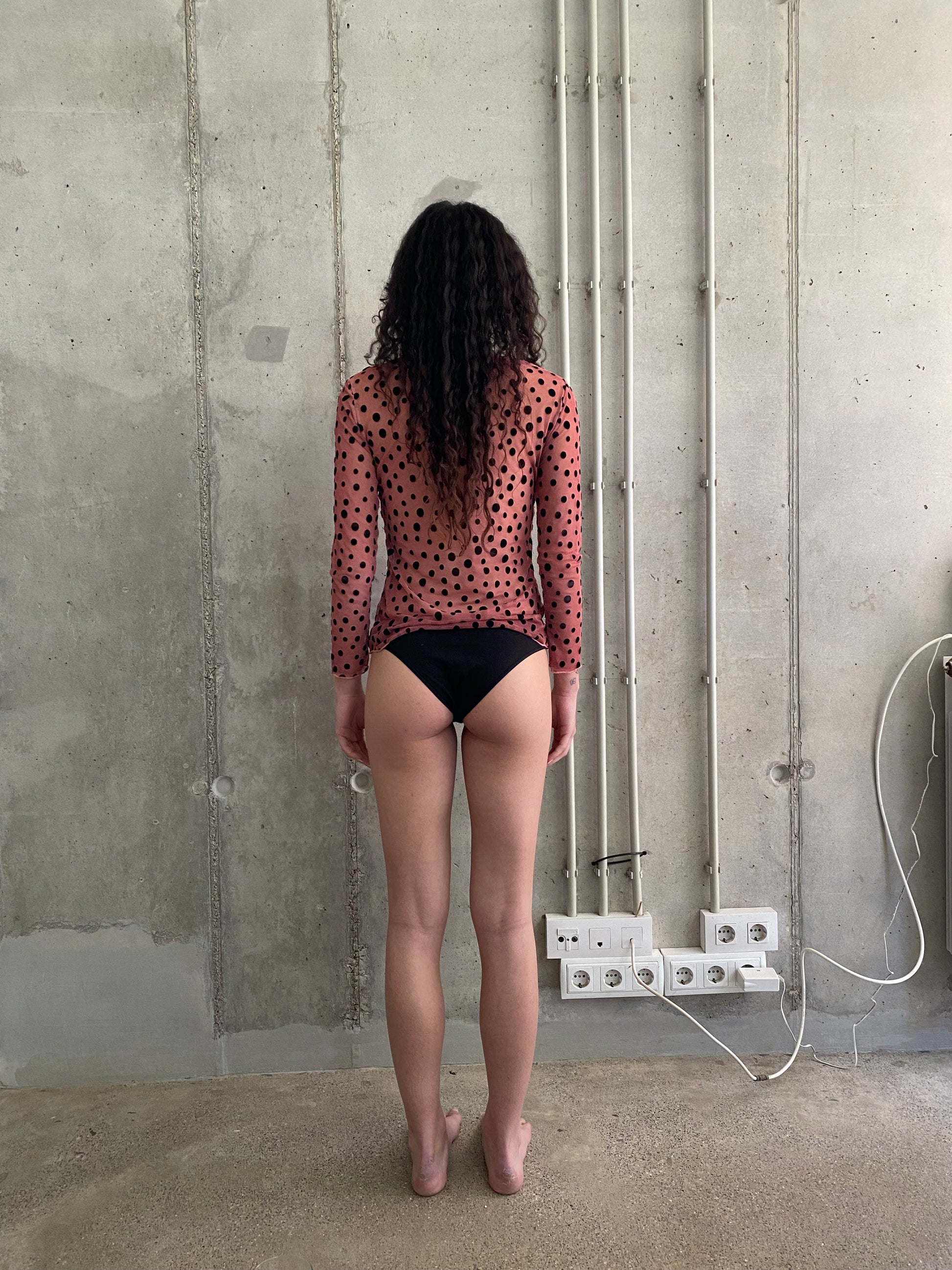 Salmon pink polka dot flocked mesh top with a sheer finish. Features long sleeves and a classic round neckline.