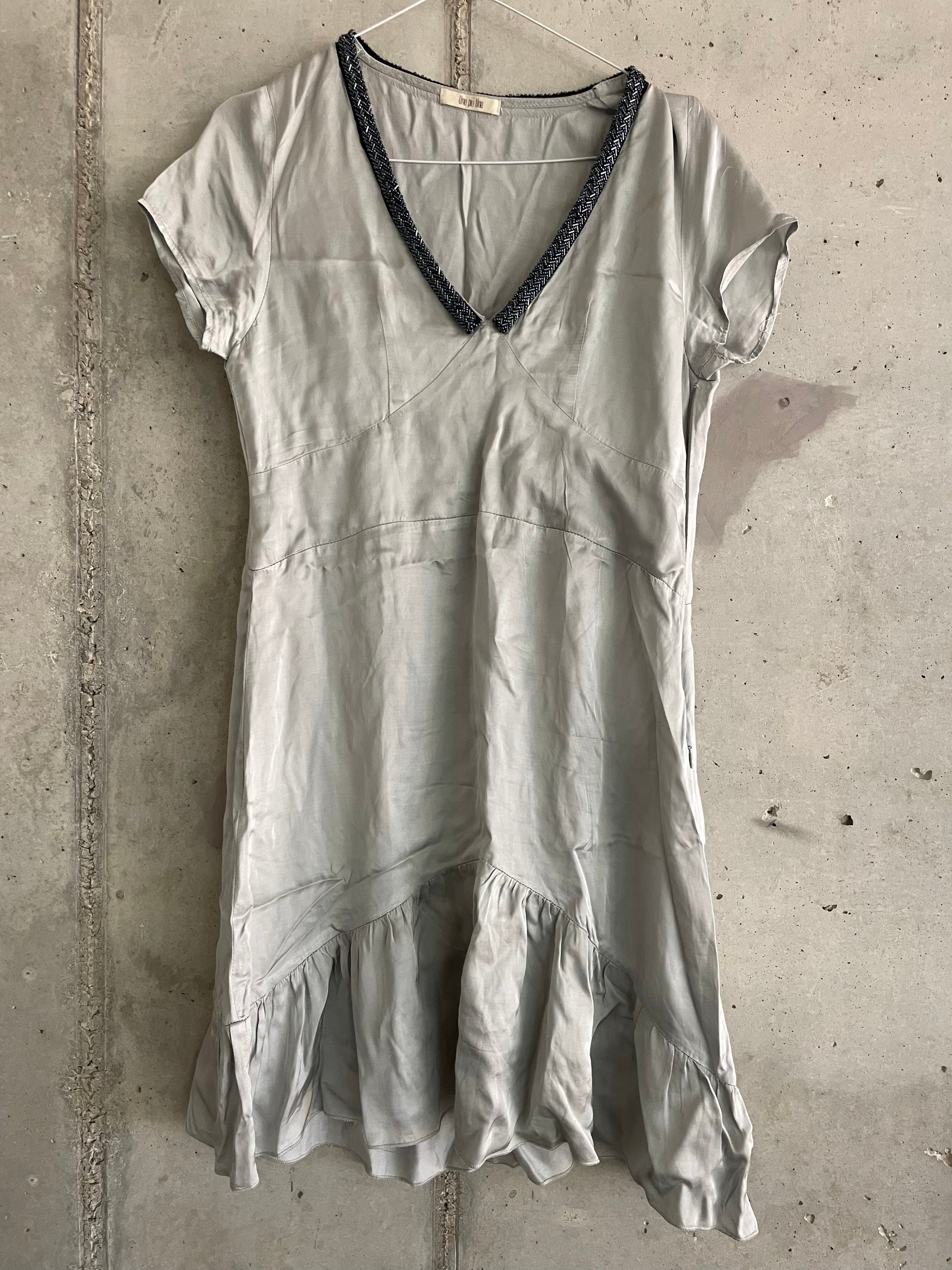 Grey silky 100% viscose dress with a deep V-neckline detailed in beaded trim. Soft, flowing fit with short sleeves and a subtle ruffled hem.