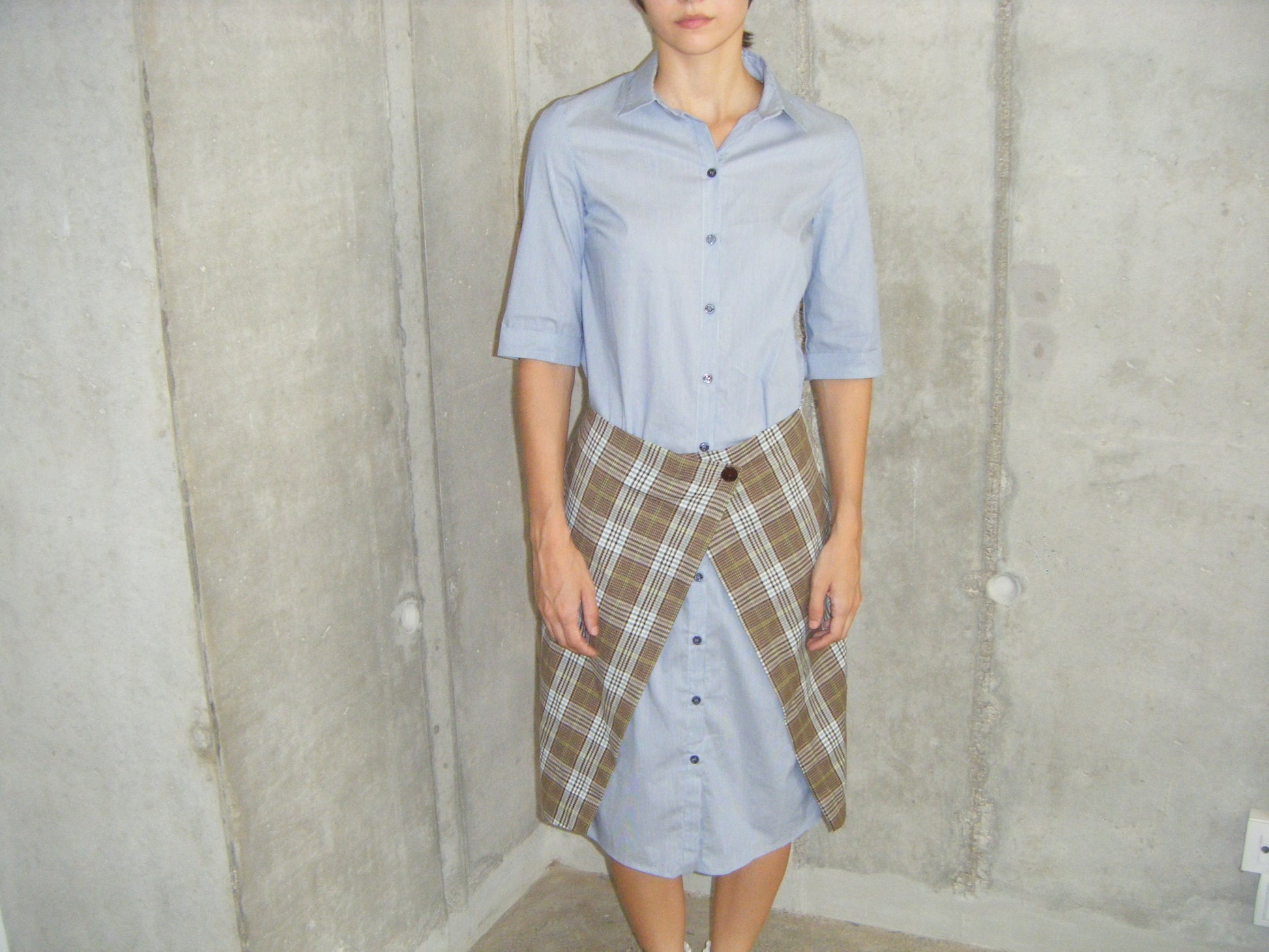 Italian designer short-sleeved shirt dress in a soft blue tone, featuring a layered panel that mimics a skirt in classic checkered tartan. Midi length with a structured yet relaxed silhouette in polin.