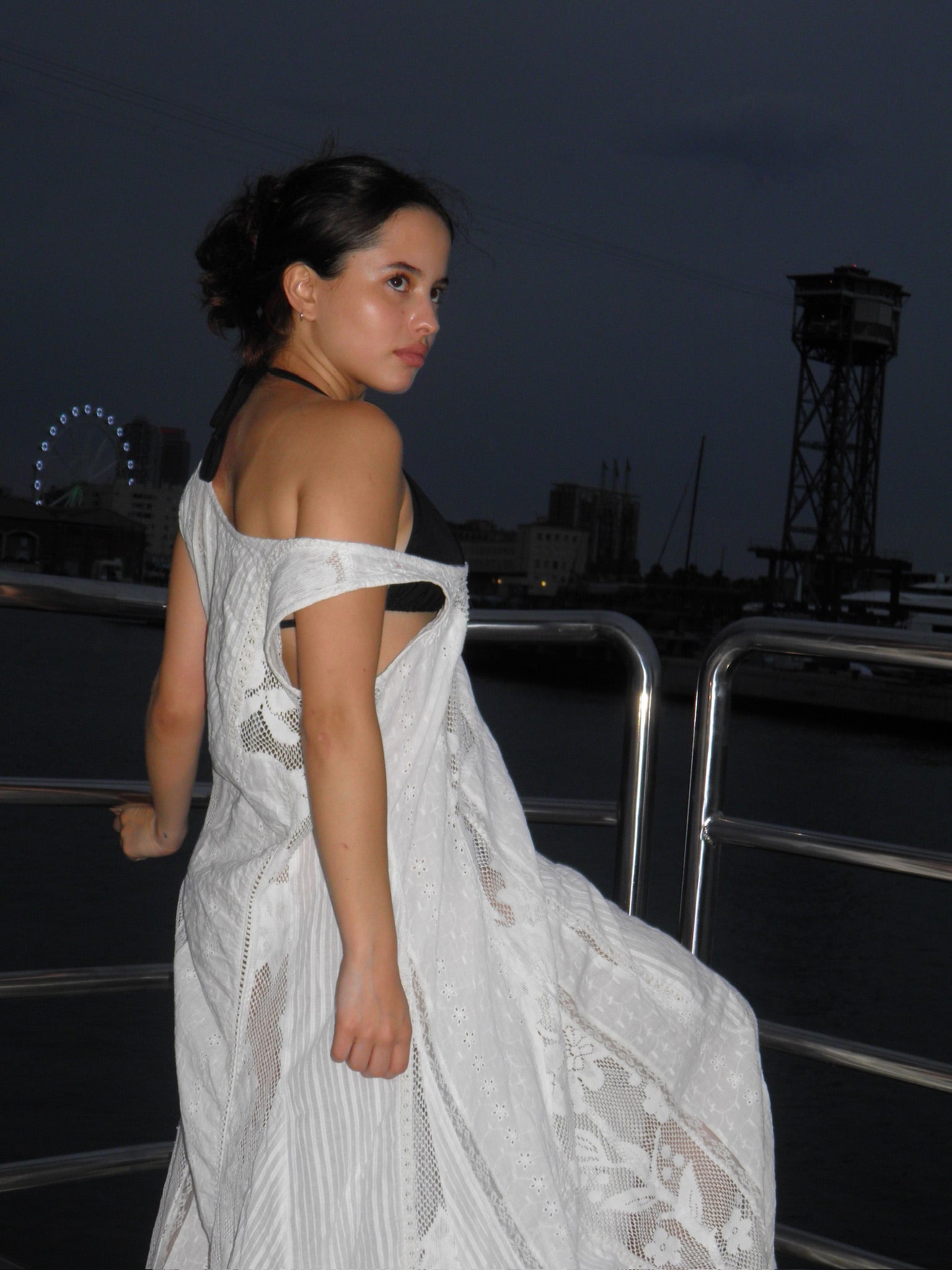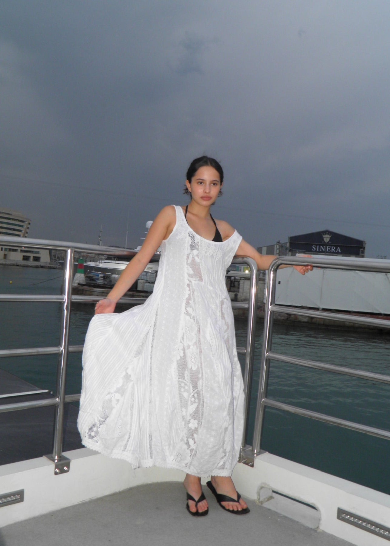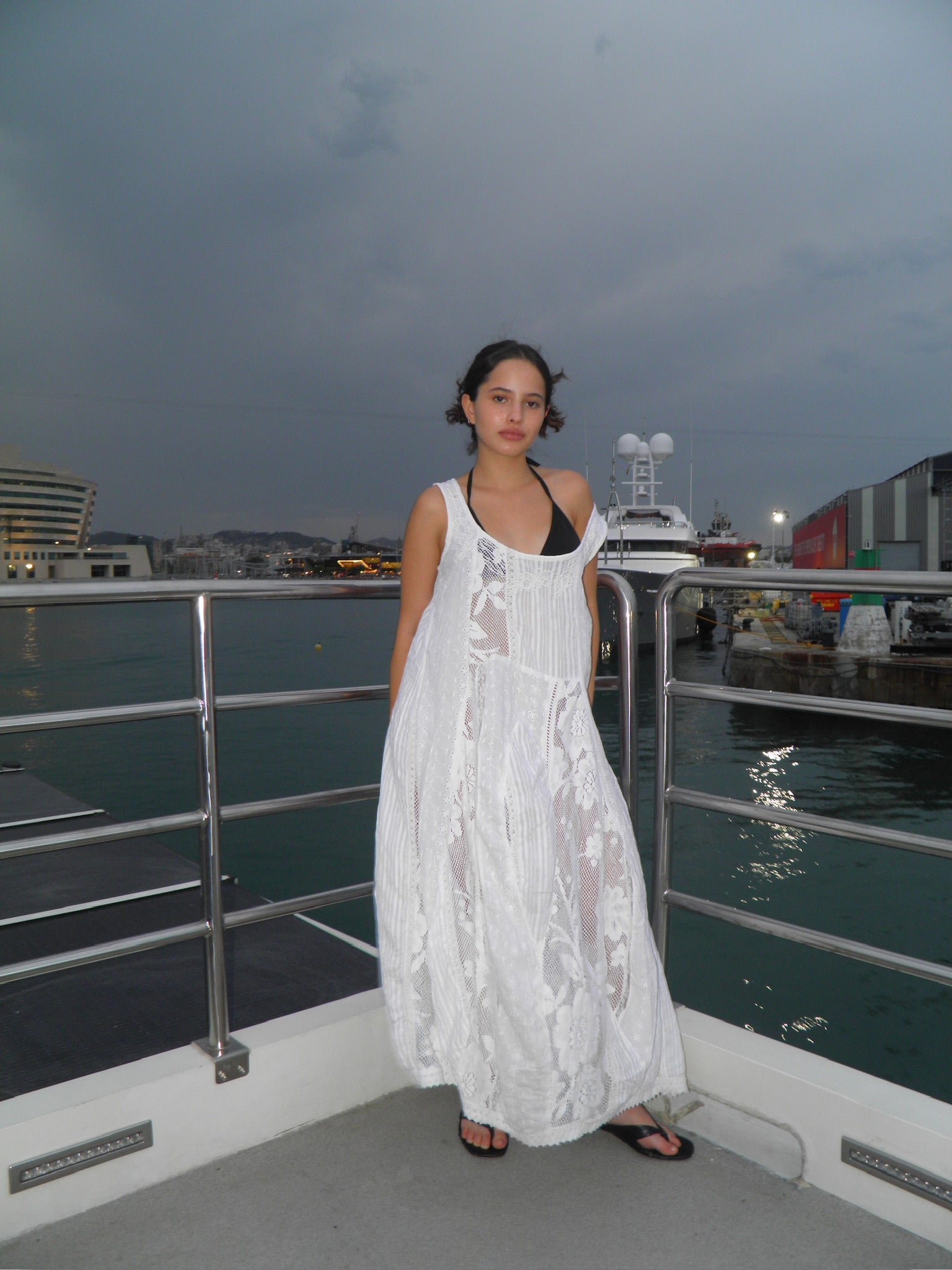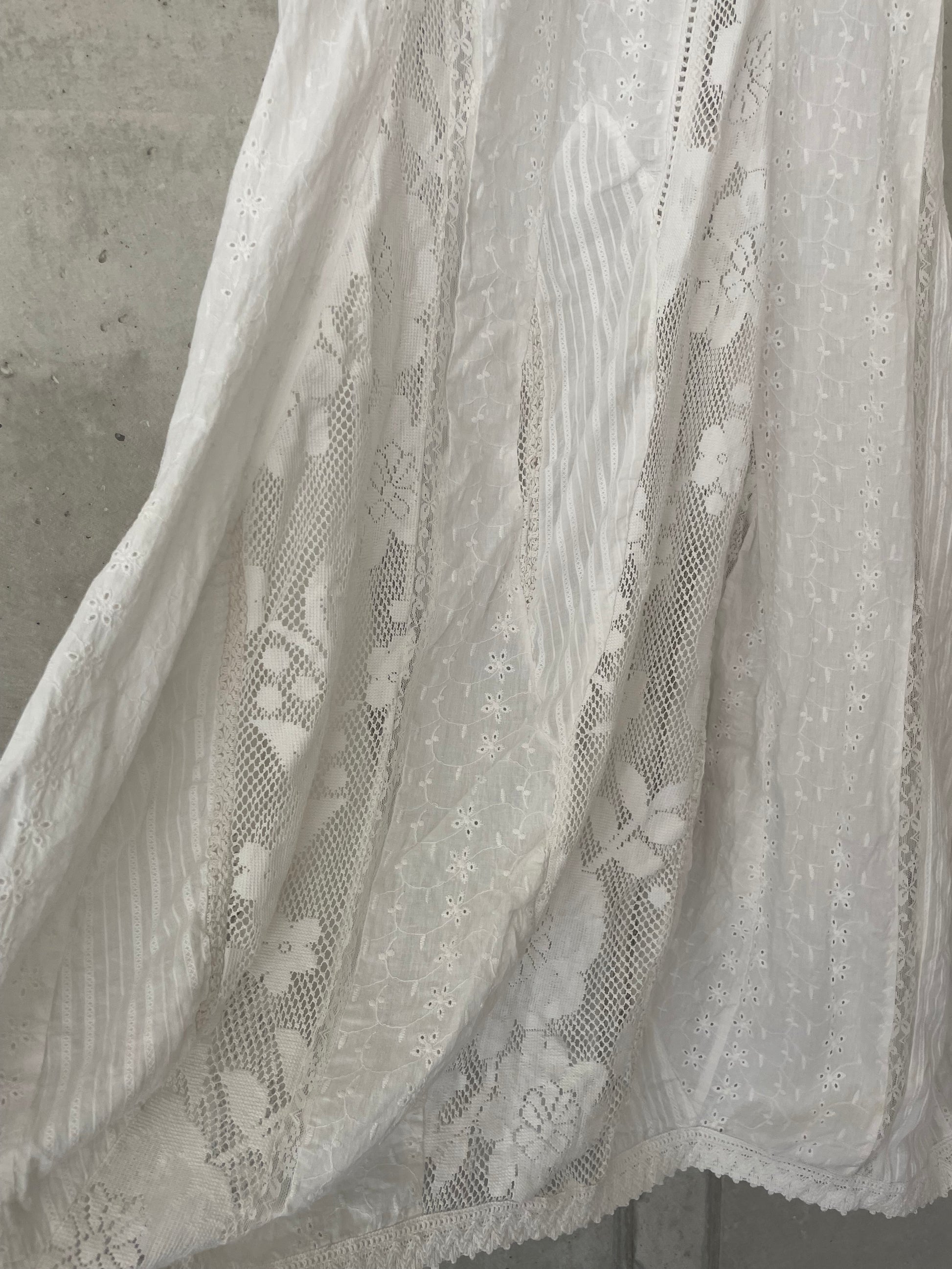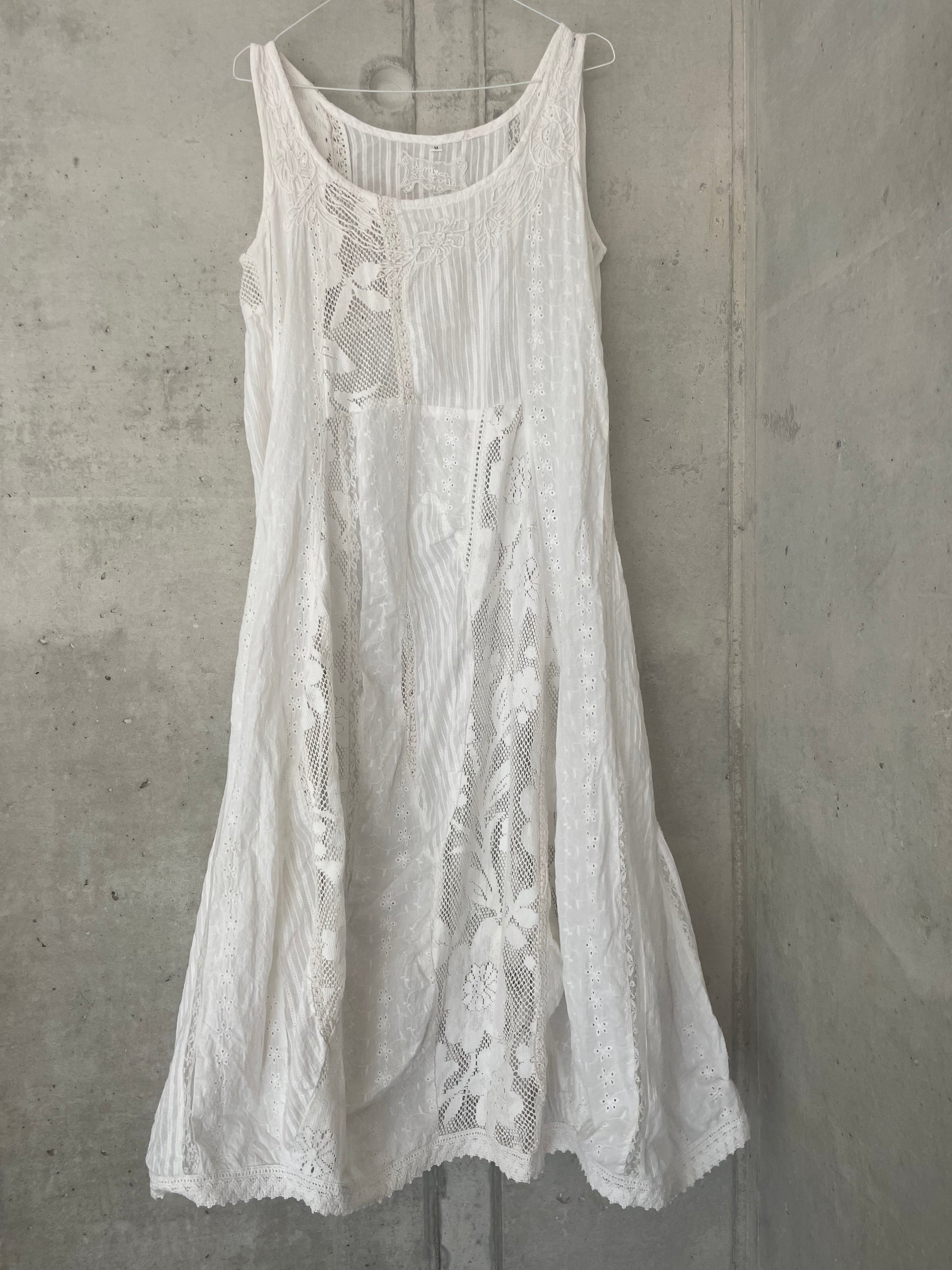 Romantic sleeveless white dress with transparencies, lace, eyelet, and embroidered details. Light and flowy.