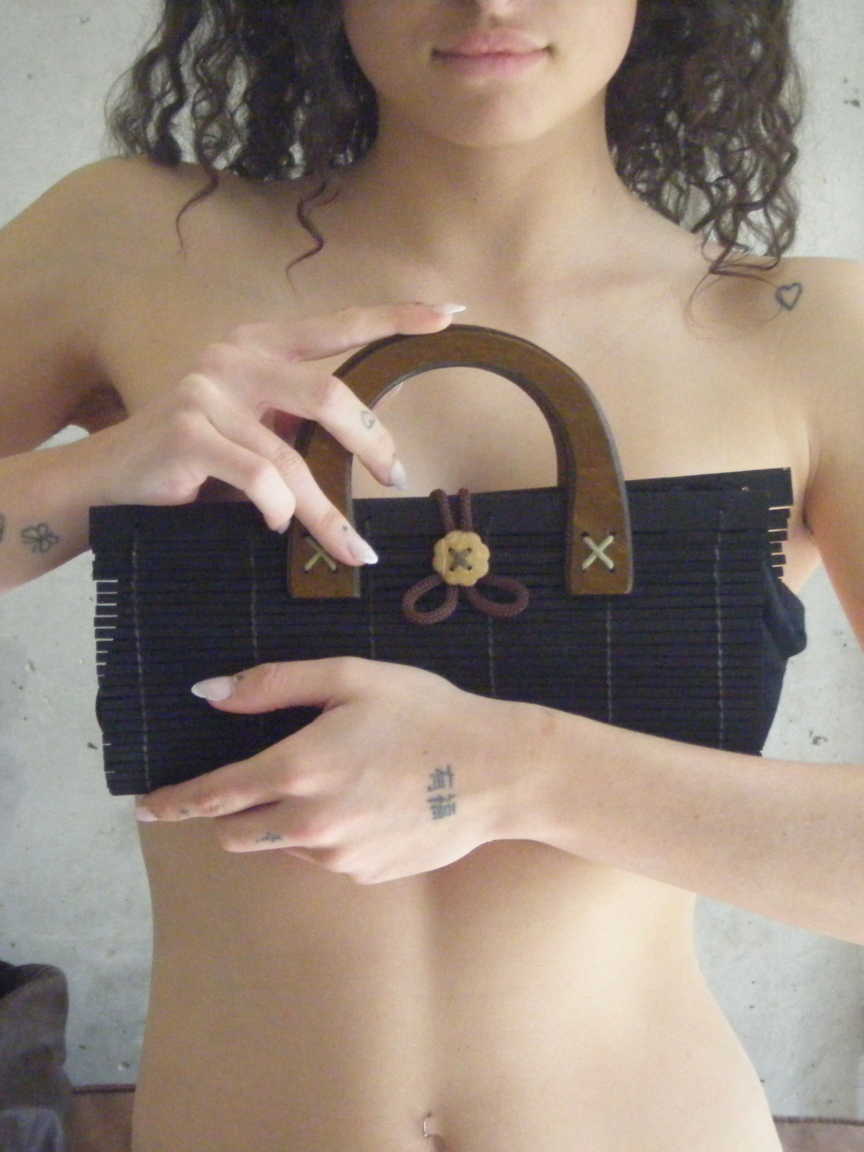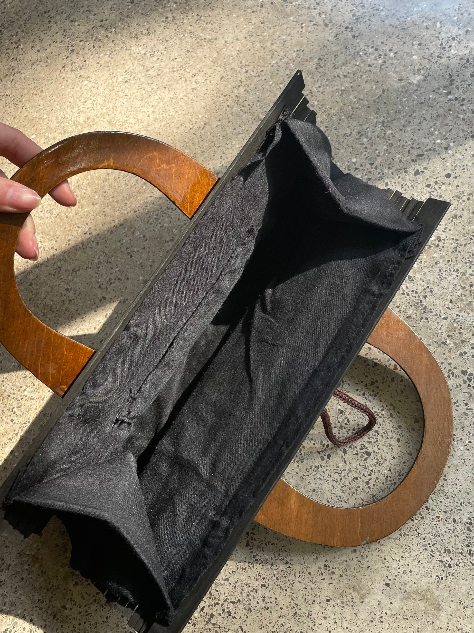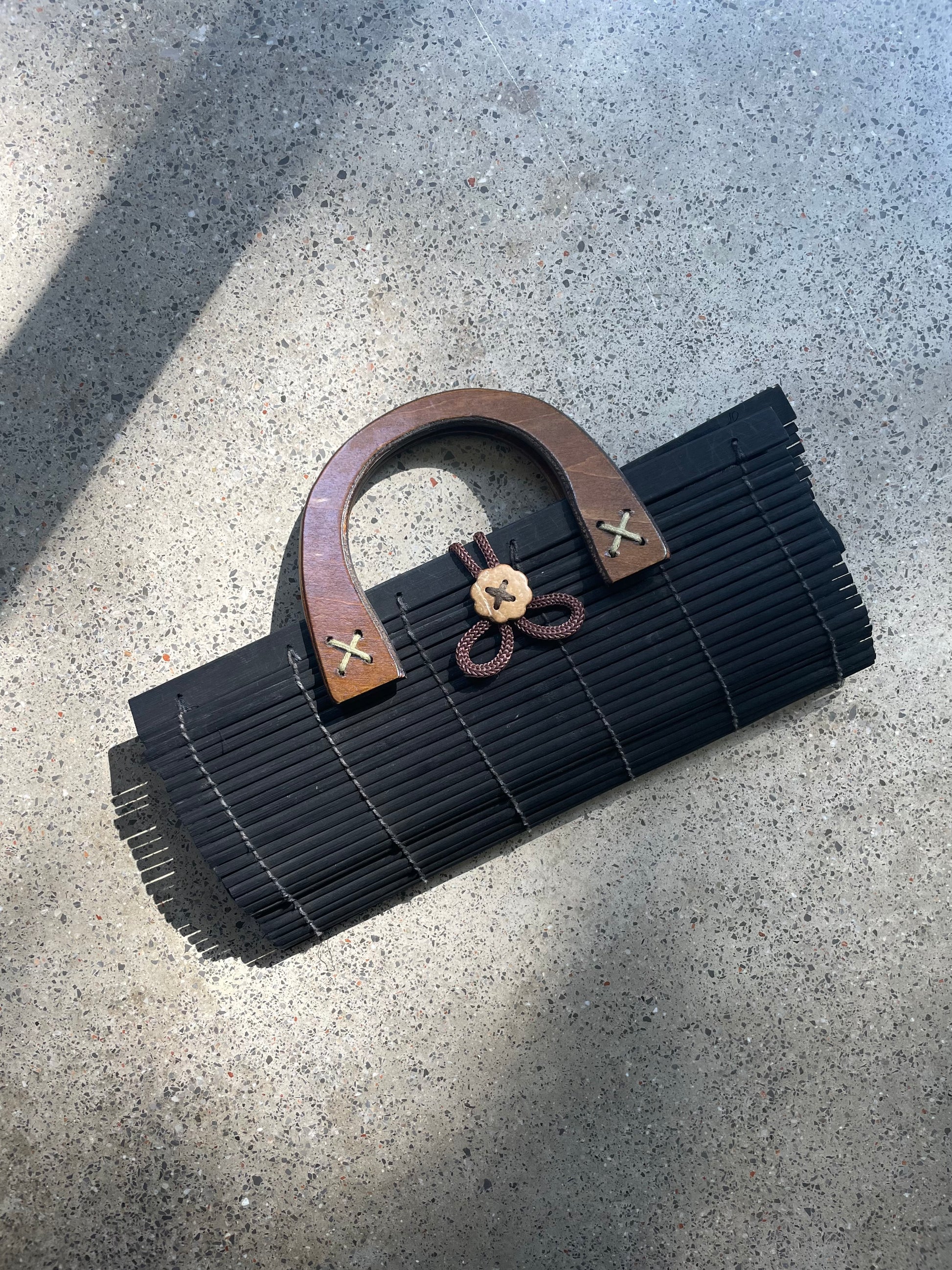 Vintage dark brown bamboo clutch with wooden handles. Designed with a structured silhouette, a button closure, and a soft fabric-lined interior.
