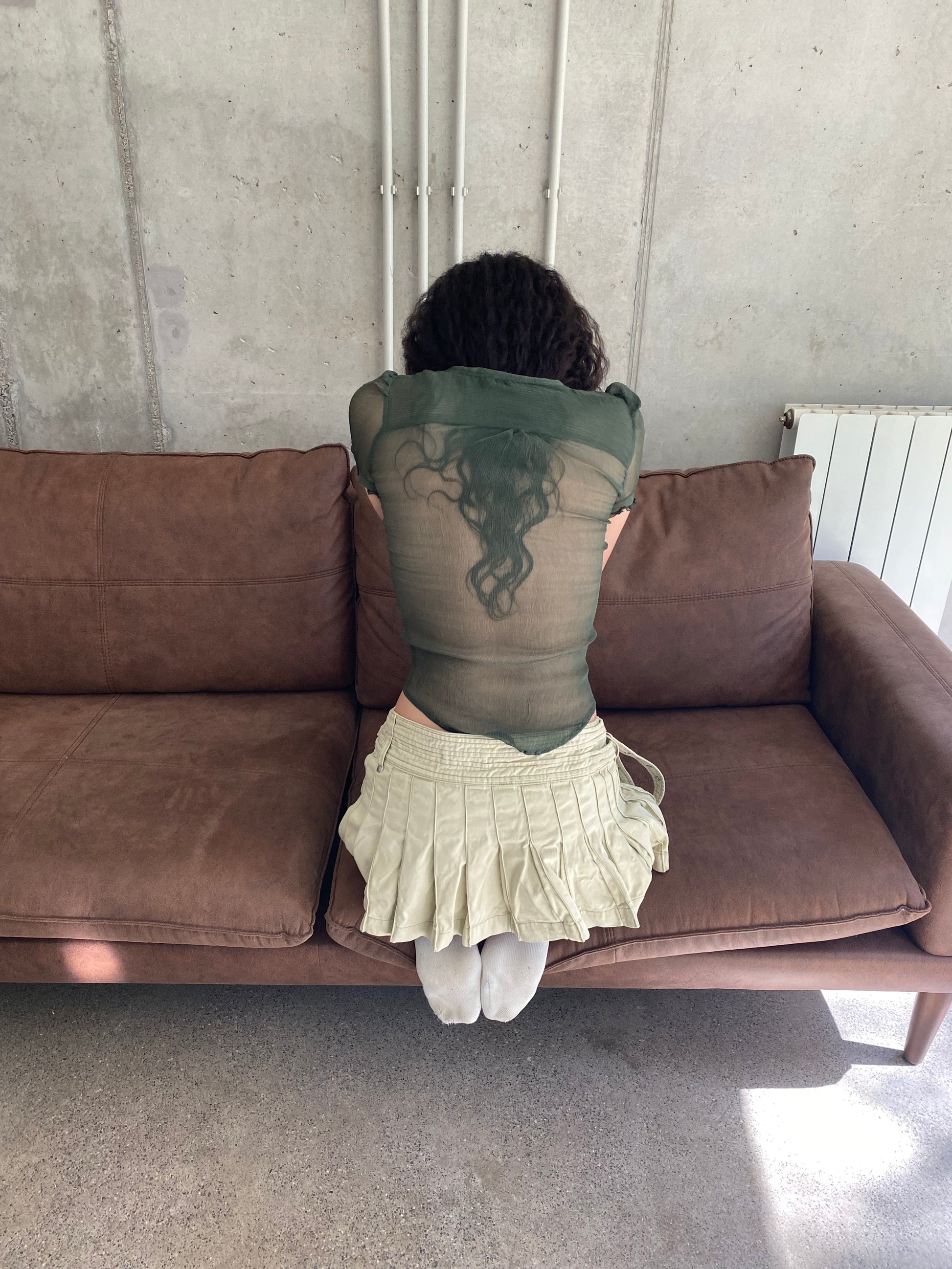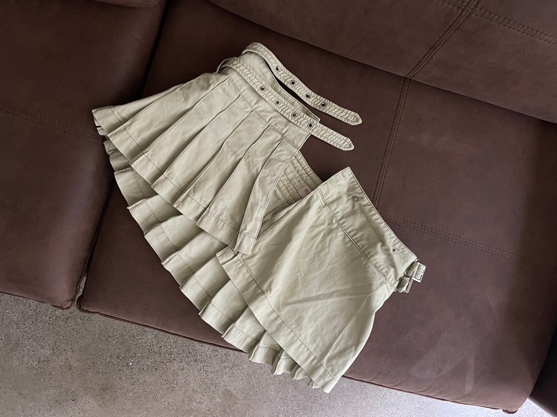 Light green, almost yellowish pleated mini skirt with a wrap-style front. The design is accented by straps and metallic buckles.